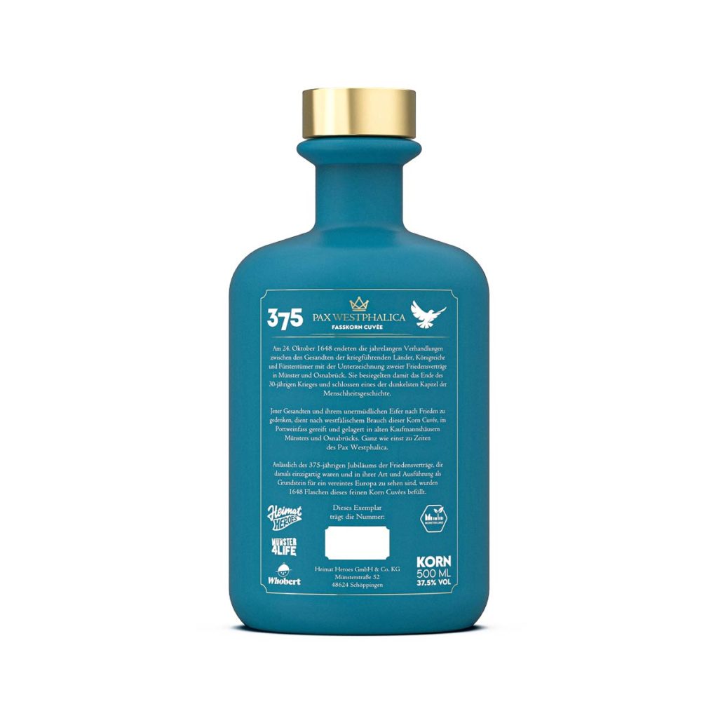 Ganze 375 Jahre ist es nun her, dass sich Gesandte aus allen Teilen Europas in Münster und Osnabrück auf einen Friedensvertrag einigten, der die Schrecken und Greul des 30-jährigen Krieges beendete und den Grundstein für ein vereintes Europa bilden sollte. Ihrem Eifer und Einsatz zu Gedenken haben wir gemeinsam mit den Heimat Heroes und dem Cateringunternehmen Whobert einen auf 1648 Flaschen limitierten Fasskorn-Cuvée produziert. Über Monate lagerte der Korn in zwei Eichenfässern, ungestört in historischen Kaufmannshäusern in Münster und Osnabrück. Bei den Fässern handelte es sich um ehemalige Portweinfässer. Das eine gefertigt aus amerikanischer, das andere aus französischer Eiche. Während der Lagerung gaben sie dem Korn in ihrem inneren mit seinem Geschmack malzigen Getreides ein ganz besonderes Aroma von dunklen Trauben und Rosinen sowie eine feine Note von Nüssen und dunkler Schokolade.